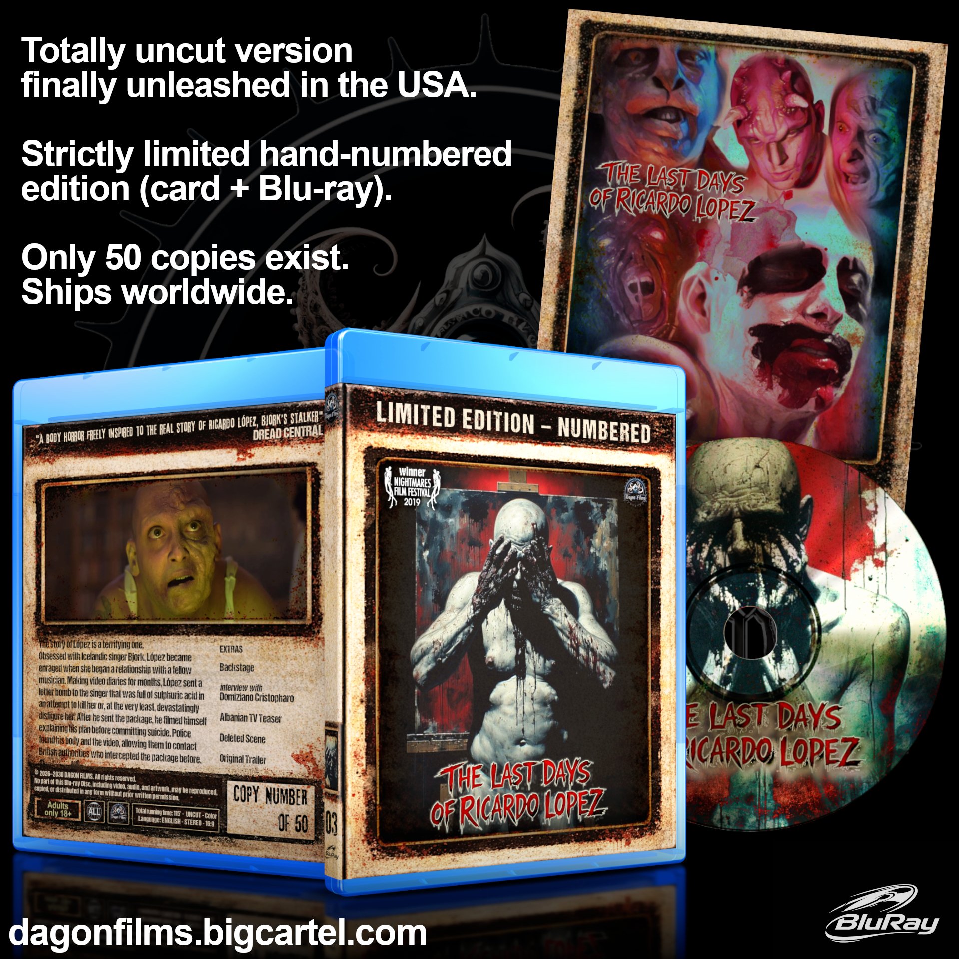 PREORDER BEGINS MARCH 2ND- MAY 2ND ORDERS WILL SHIP AFTER PREORDER PERIOD ENDS. LIMITED TO 50 COPIES. HAND NUMBERED. POSTERS ONLY INCLUDED IN PREORDERS. Release #3 Presented totally uncut in the USA. From director Domiziano Cristopharo , The Last Days of Ricardo Lopez is a body-horror fever dream freely inspired by the infamous case of Björk’s stalker. Ricardo Lopez is a lonely, unraveling young man whose obsession with an untouchable pop icon curdles into jealousy, delusion, and hatred. Recording his descent in obsessive video diaries, Ricardo spirals toward a final, irreversible plan, one meant to scar a goddess and immortalize his suffering. As fantasy and reality collapse, love becomes infection, and the last days of Ricardo Lopez play out like a confession filmed at the edge of sanity.